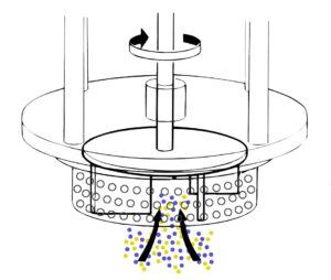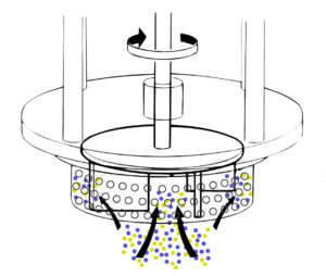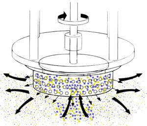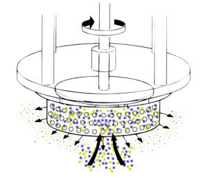 Material is centrifugally forced to the tolerance between the rotor and inner walls of the stator where milling action takes place.